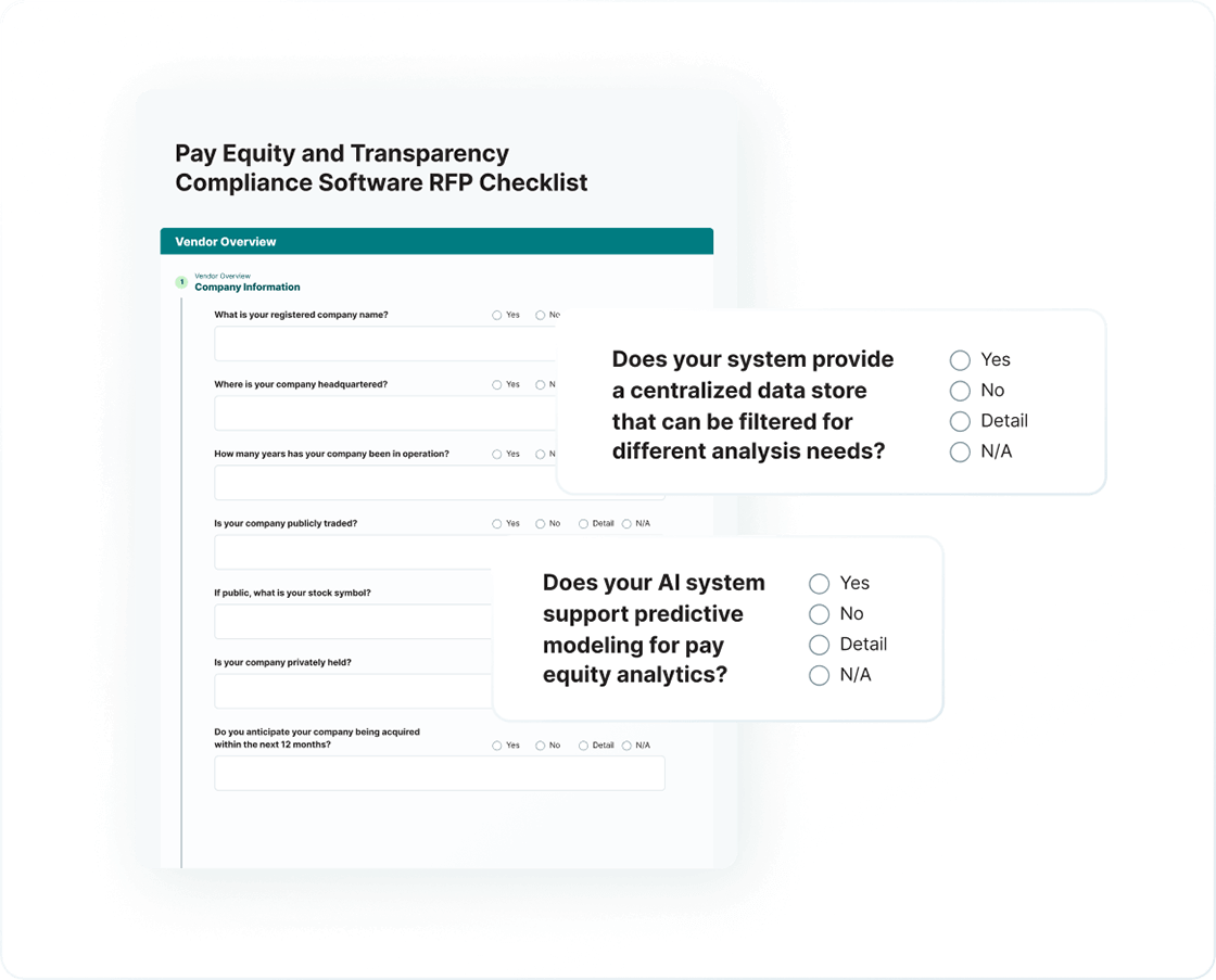 Designed for Total Rewards, HR, and Compliance leaders responsible for pay equity at scale, this Pay Equity RFP Checklist is your essential guide to evaluating and selecting the right technology partner for pay equity and transparency. From identifying unexplained pay gaps equal or greater to 5% (as mandated by the EU Pay Transparency Directive) to evaluating cross-border reporting readiness, the checklist helps you ask the right questions from the start.